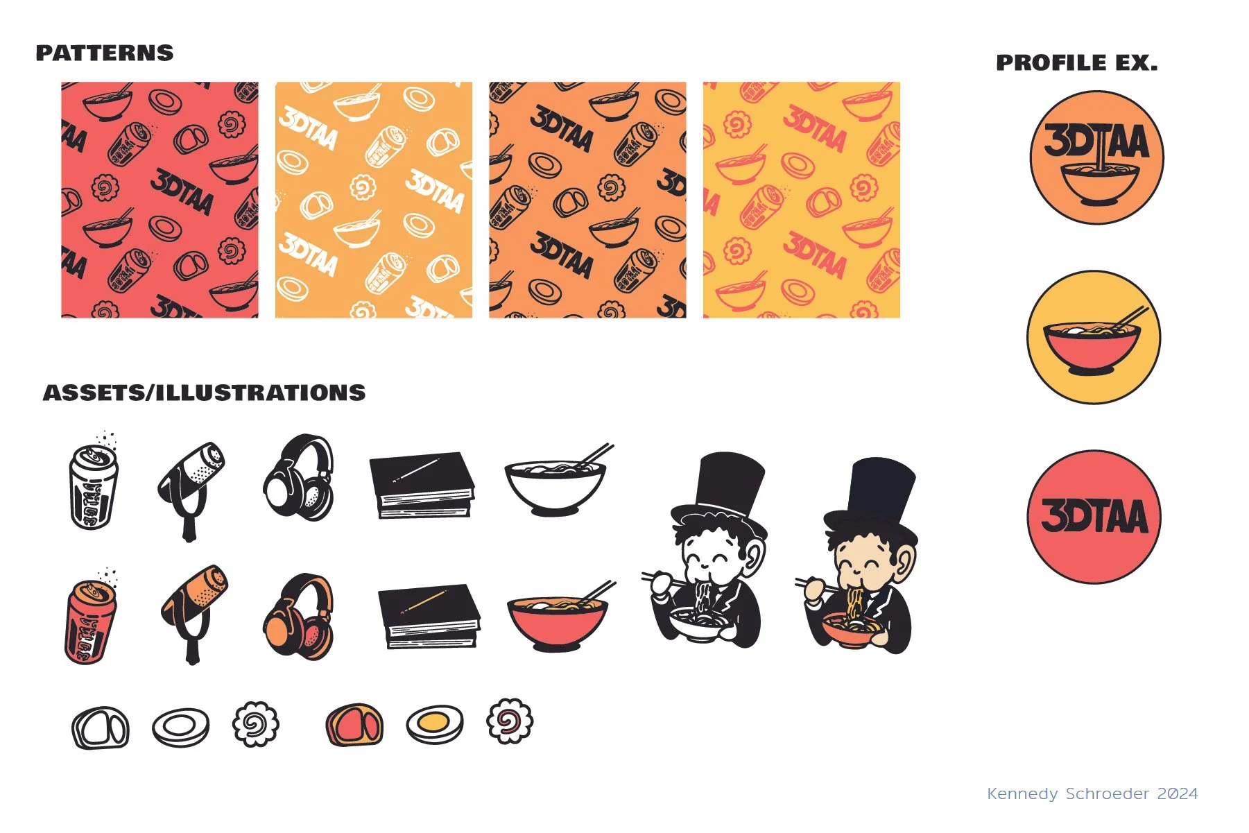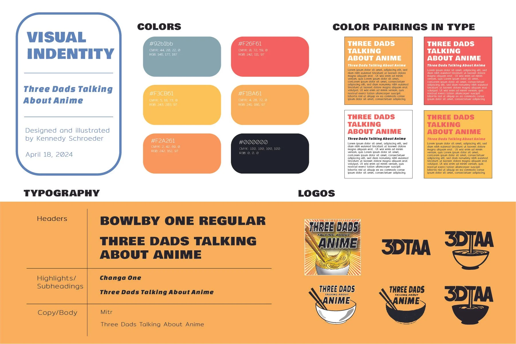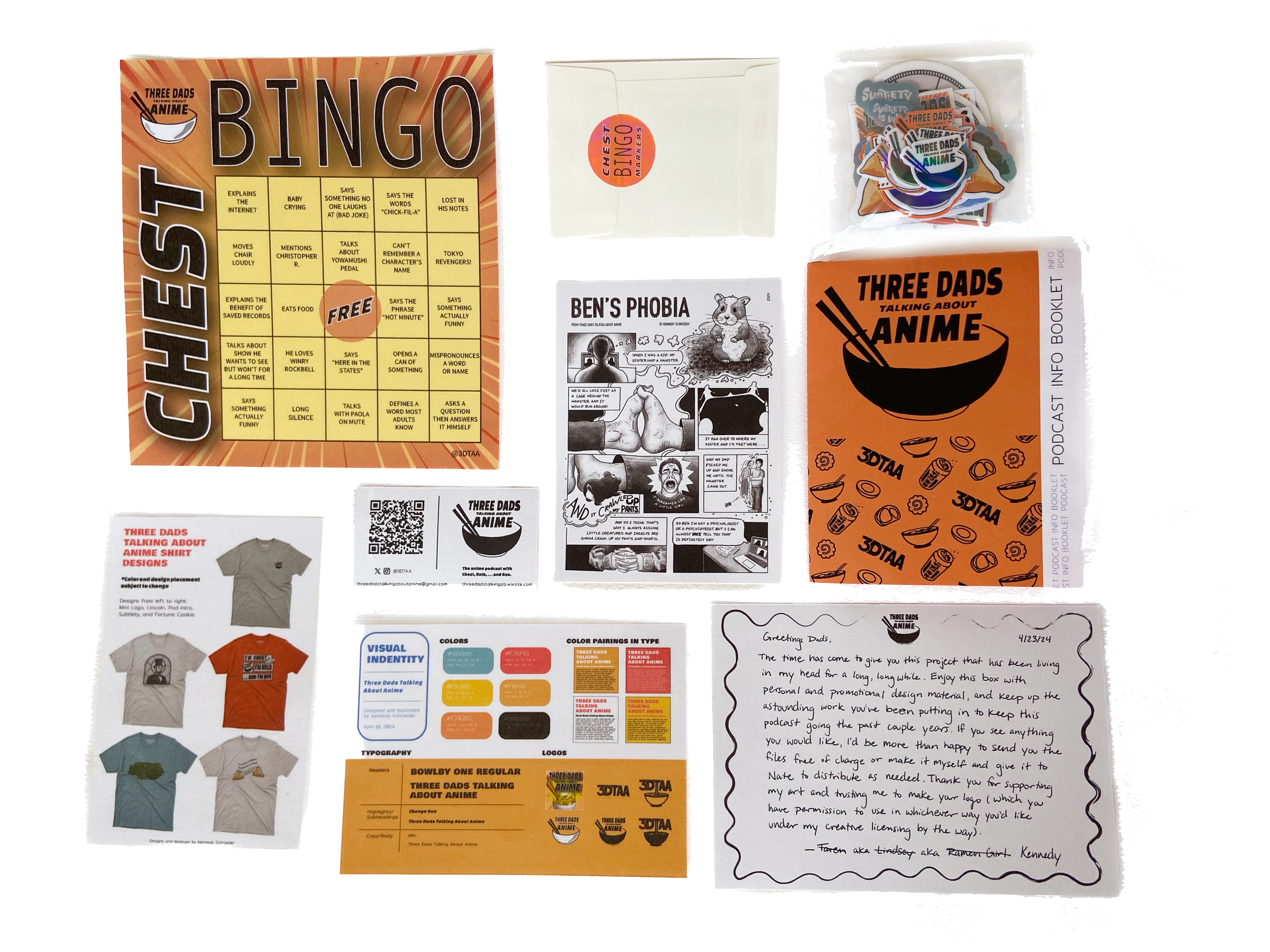 Since designing Three Dads Talking About Anime’s podcast cover art in 2021, I’ve wanted to do a more thorough visual identity for their brand. At the beginning of 2024, I began constructing a public relations box filled with custom promotional design material. This handmade box contains a note on custom stationary, a printed out guide to the visual identity, mockup shirt designs, an informational zine that unfolds into a poster, business cards, matte and holographic stickers, a comic, and custom bingo cards and markers to play along while listening to the podcast.